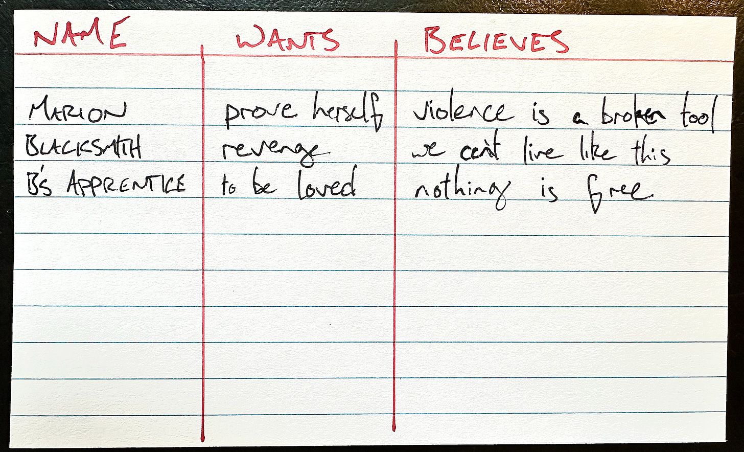 The process is simple. Just write the NPCs’ names on an index card. Next to each one, write what they want, and what they believe. The skill involved is to pick simple, interesting and game-able desires and beliefs: ones that will