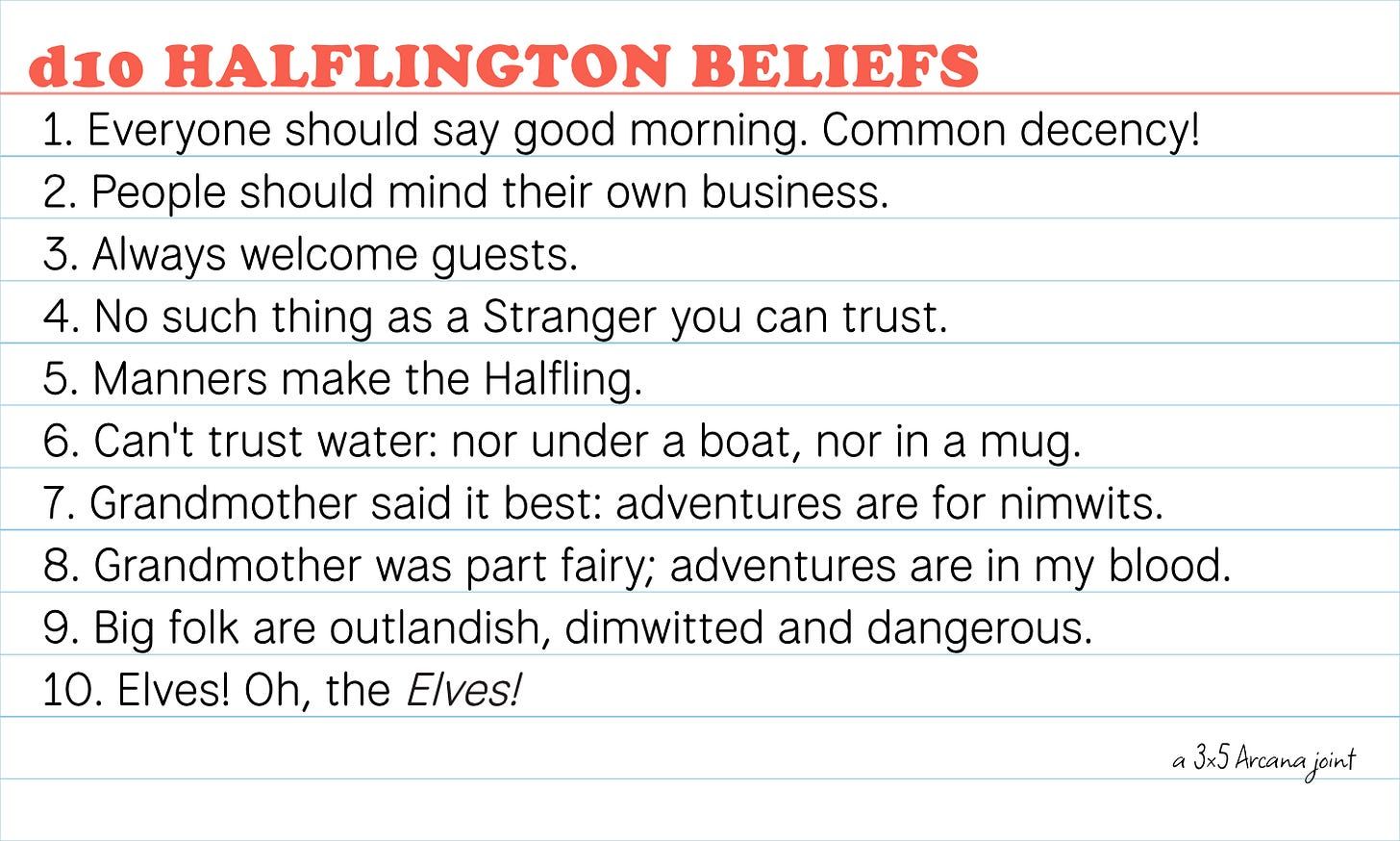 Here are 10 beliefs that might create the culture of a Halfling Shire. For each NPC, roll once on the table to give you a belief of theirs. Let it color how they interact with the world.